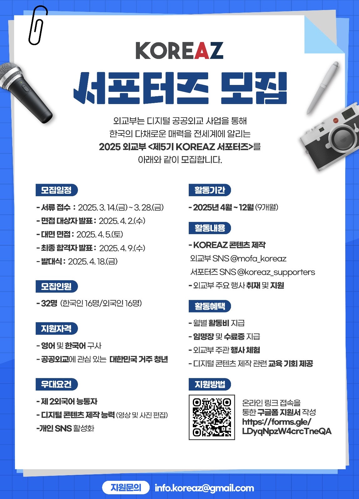 외교부는 디지털 공공외교를 통해 대한민국의 다채로운 매력을 전세계에 알리는 2025 외교부 <제5기 KOREAZ 서포터즈>를 모집합니다!